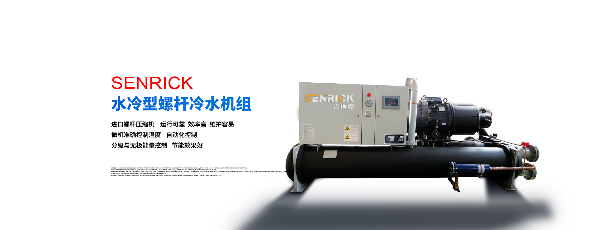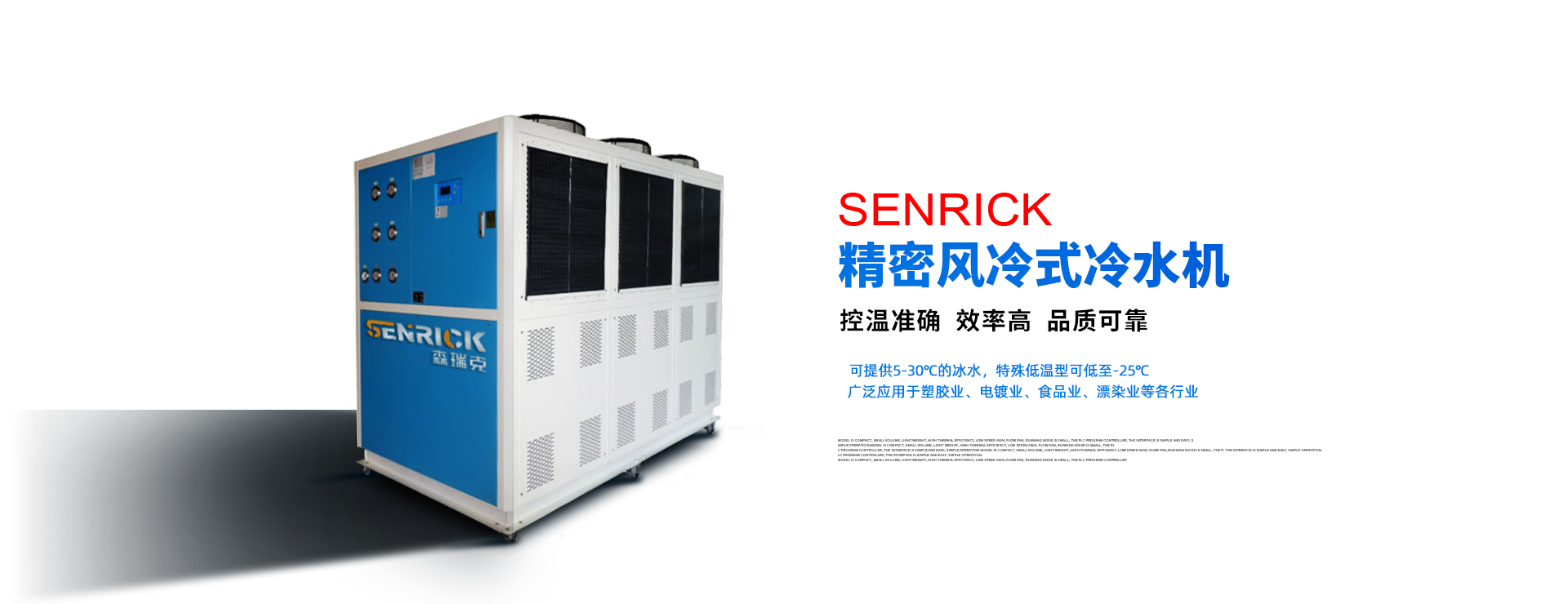 森瑞克機械(蘇州)有限公司(簡稱:SENRICK)是一家中外合作性企業,引進技術,專注于工業制冷設備,工業溫控設備,非標制冷設備,集激光,化工,真空設備輔機等集研發、生產、銷售、服務于一體的的現代化科技企業。公司擁有完善的制造設備,先進的檢測系統,獨立的加工、生產工藝,一支開拓創新專業有素的技術人才團隊,以及全面的質量控制體系,為產品質量的不斷優化提供了強大的保障,以確保滿足不同市場的各種需求。經過多年的努力企業相繼研發生產出了工業冷水機,工業冷風機,工業冷油機,工業機,低溫冷水機,低溫冷風機,低溫冷油機,螺桿式冷水機...